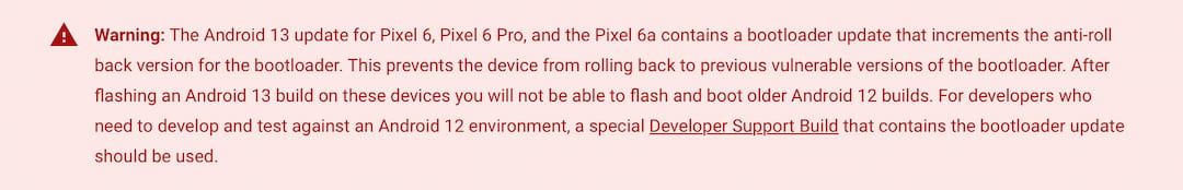 Once you’ve updated to Android 13 on Pixel 6 devices, the anti-rollback feature in the new bootloader prevents you from reverting back to a previous version.